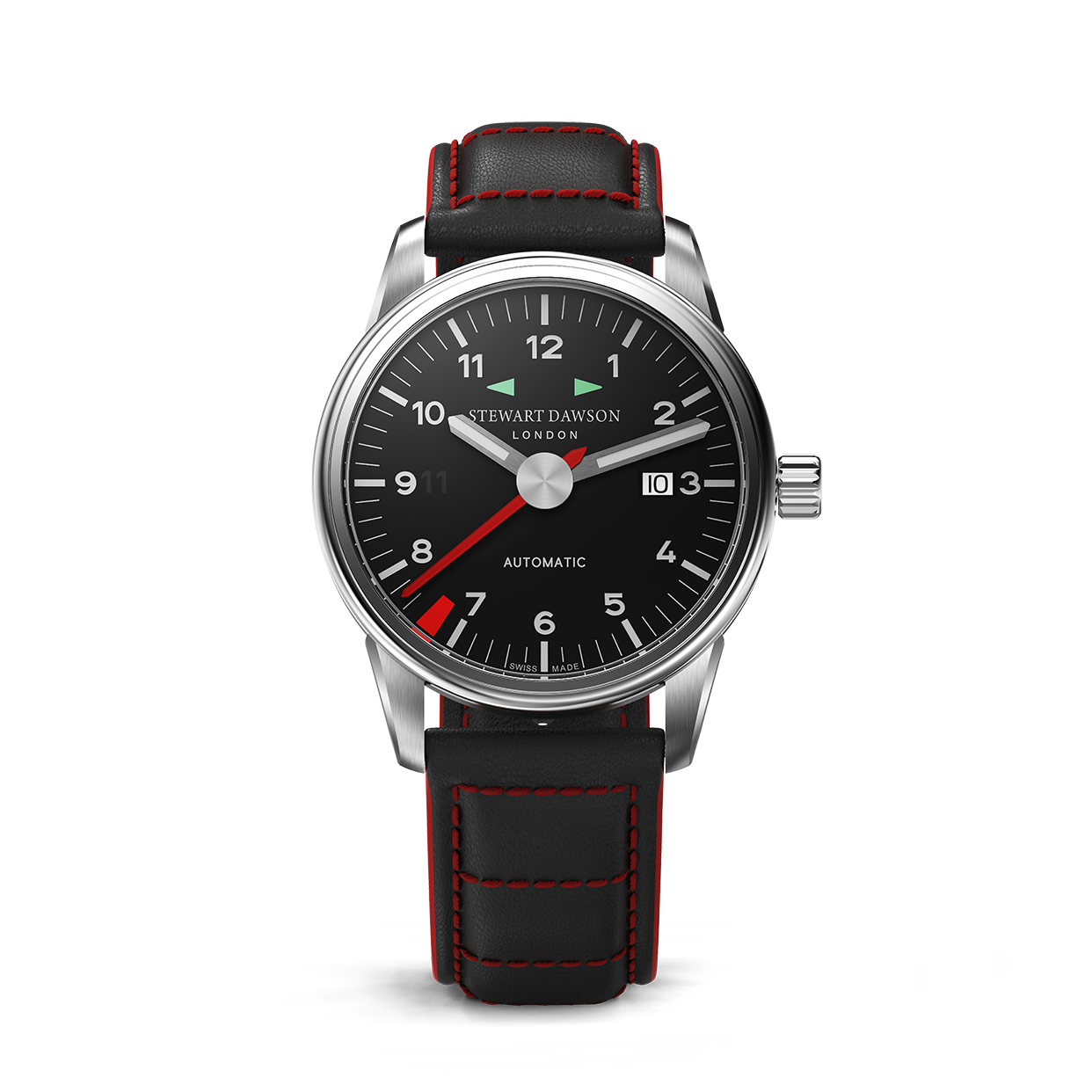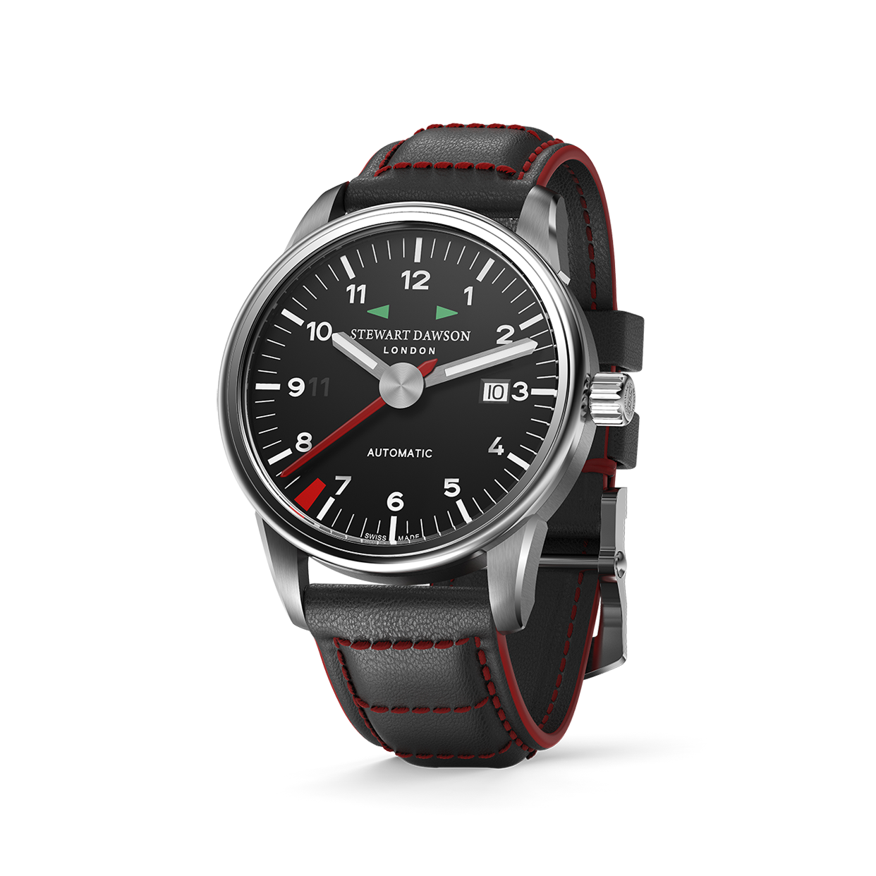 Connection begins at the wrist. The leather strap recalls period sport seats. The 316L steel case settles against the skin with controlled mass. The machine is at one with its owner.