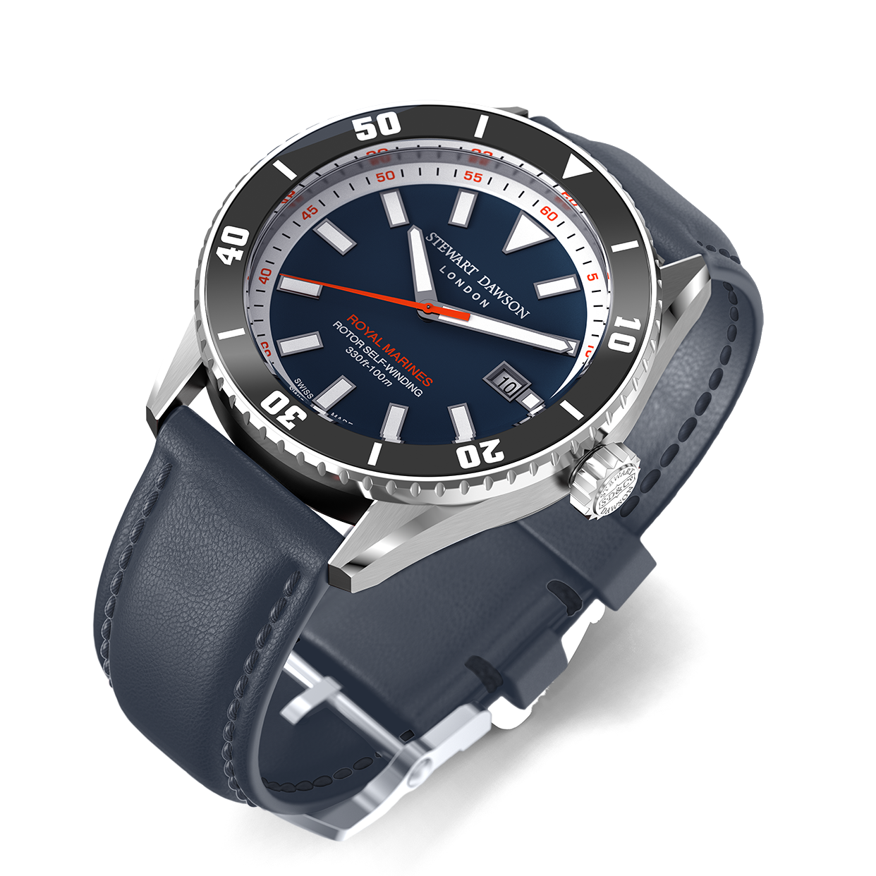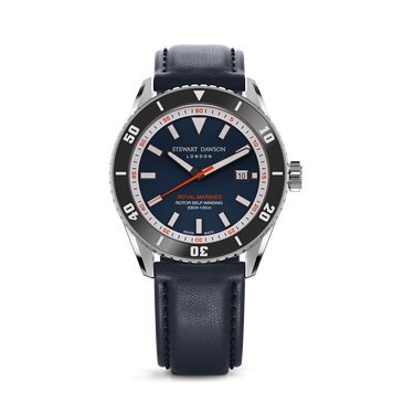 The Royal Marines watch is defined by its bold, contemporary presence: a sturdy 42 mm steel case frames a deep blue dial marked by applied indexes and crisp steel hands, all glowing with SuperLuminova for striking contrast and legibility.