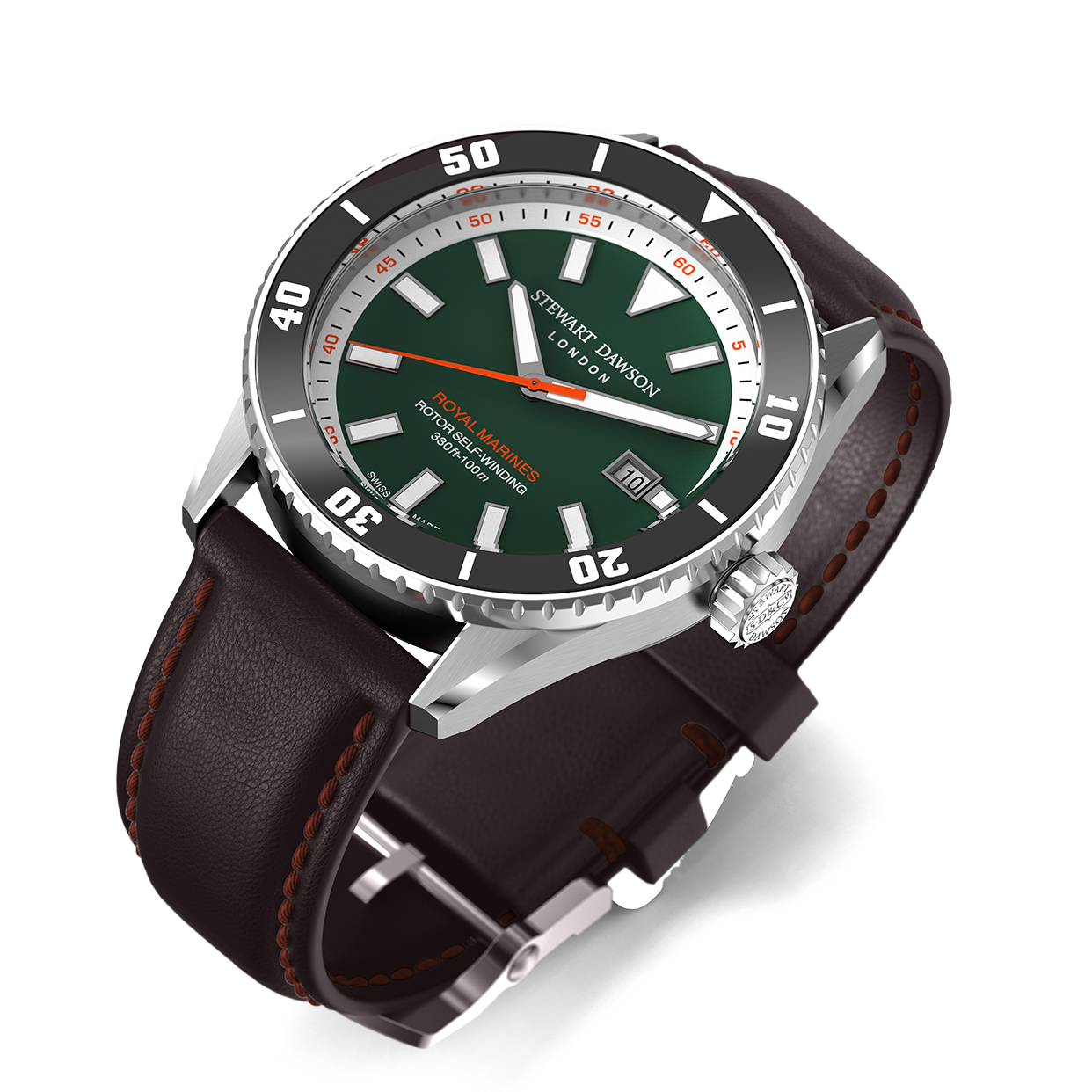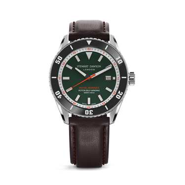 The Royal Marines watch is defined by its bold, contemporary presence: a sturdy 42 mm steel case frames a striking green dial marked by applied indexes and crisp steel hands, all glowing with SuperLuminova for striking contrast and legibility.