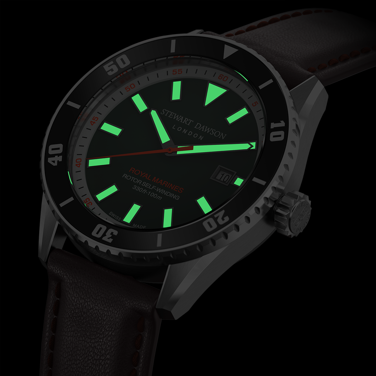 Engineered for the most demanding environments, the Royal Marines provides unfailing tactical legibility. A heavy application of Super-LumiNova on the hands, indexes, and the critical markers of its unidirectional dive bezel ensures dive times can be monitored with absolute clarity, even in zero-visibility deep-water conditions.