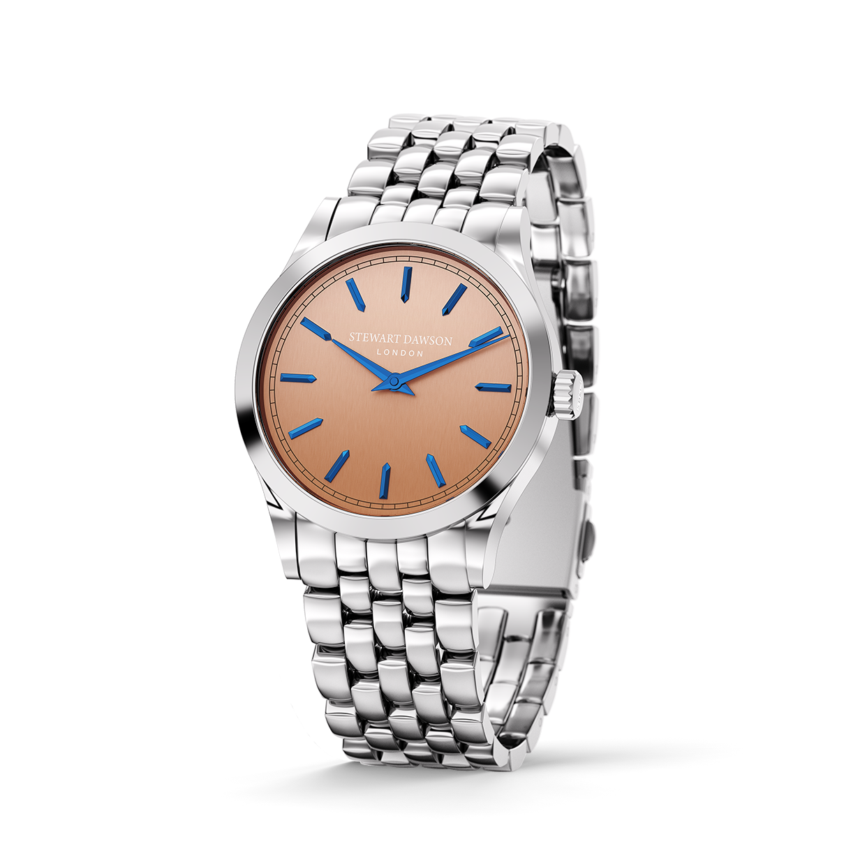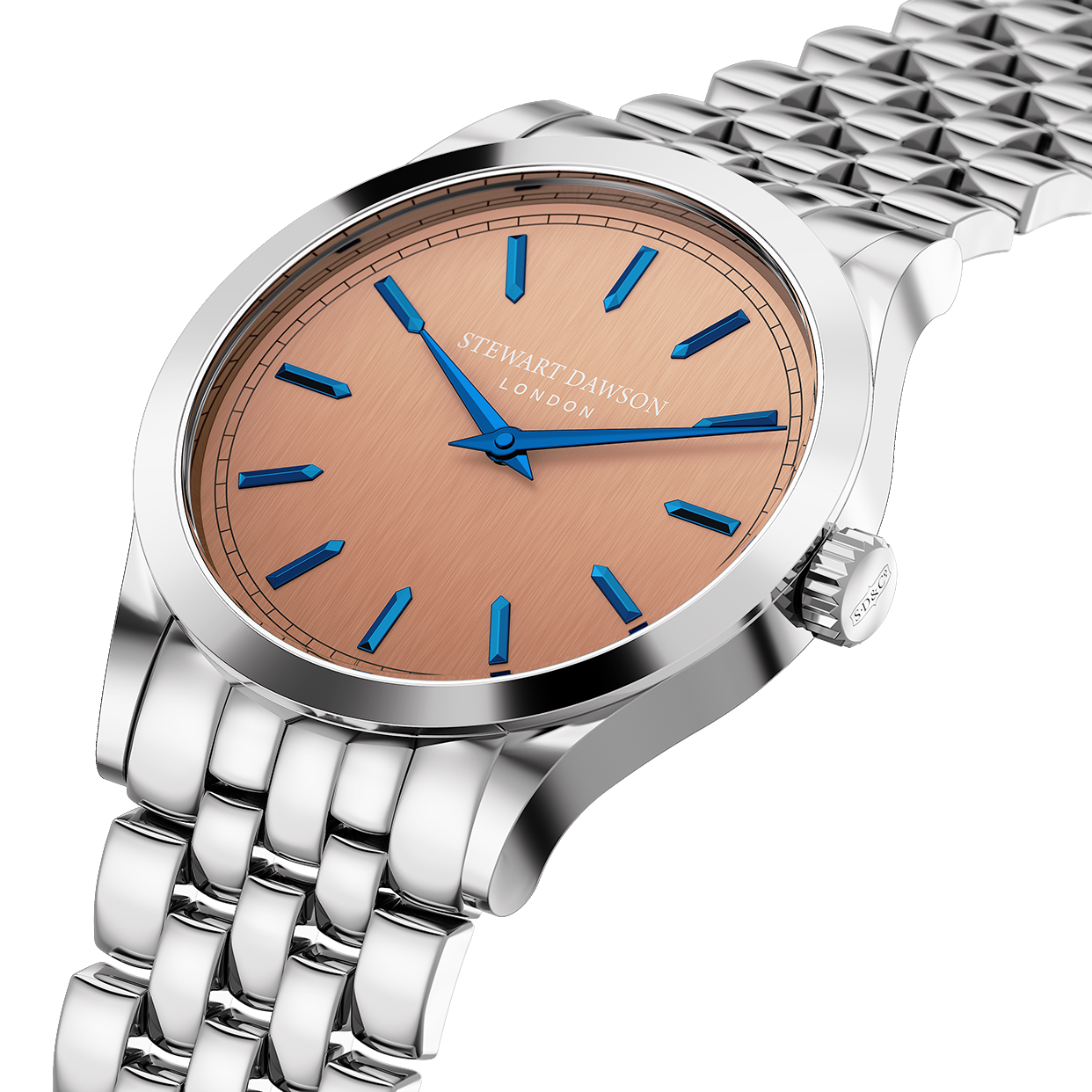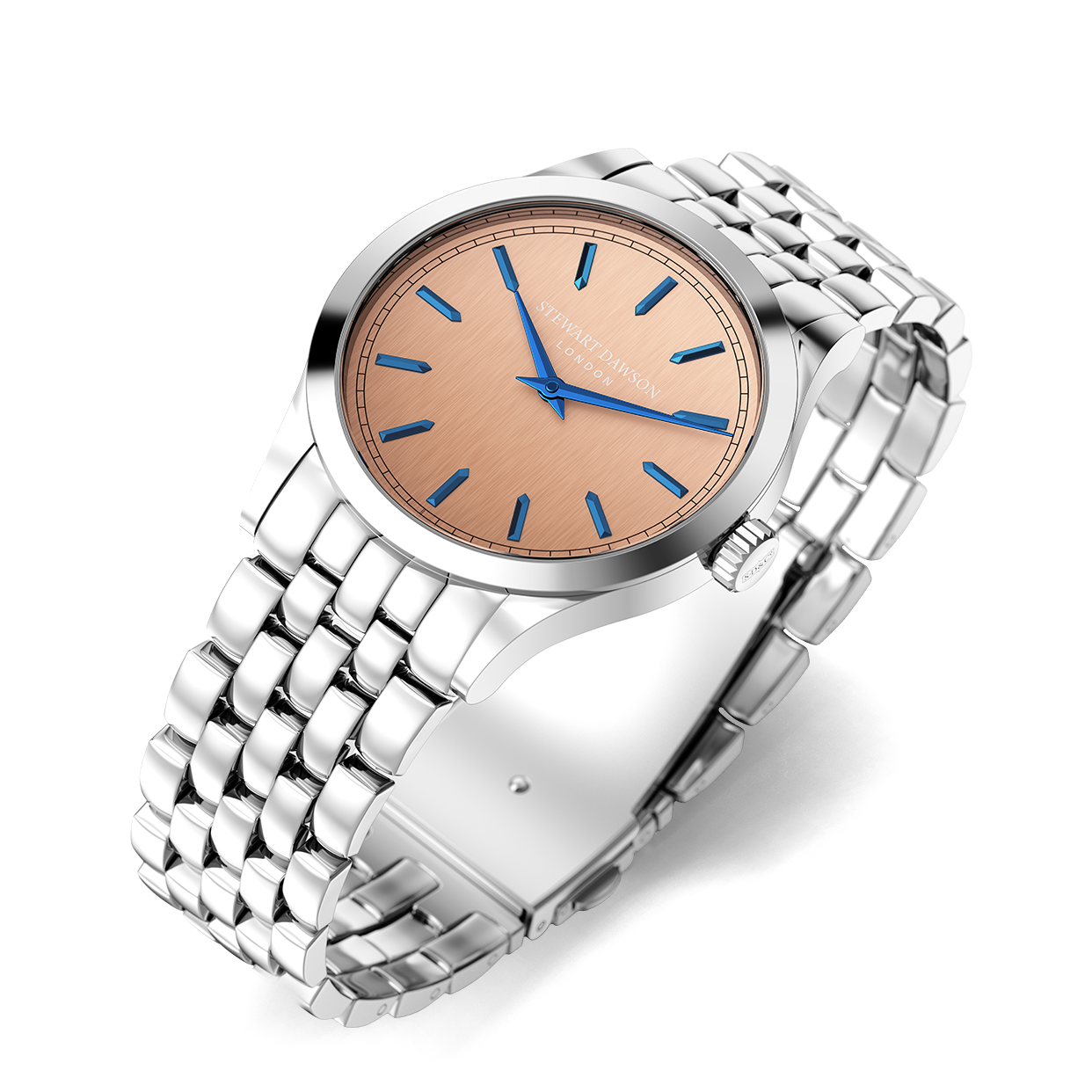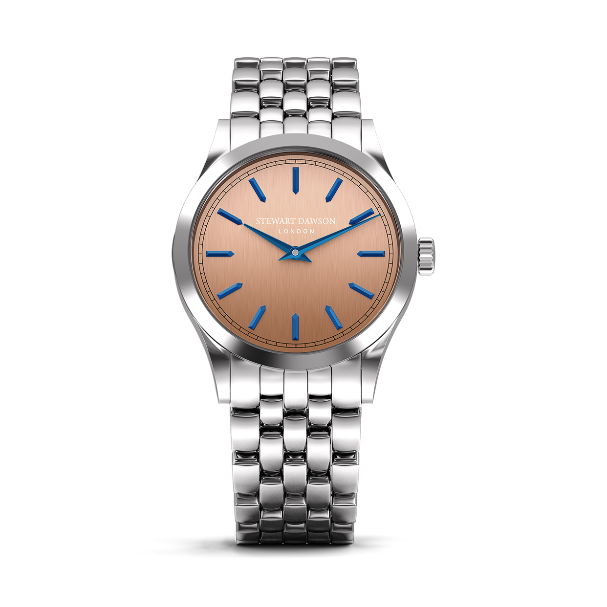 Slim steel hands glide over the dial, protected by a sapphire crystal for enduring clarity and brilliance. The polished steel bracelet with deployant clasp delivers both comfort and style, enhanced by the iconic Stewart Dawson logo. A refined statement piece for any occasion, exuding sophisticated simplicity.