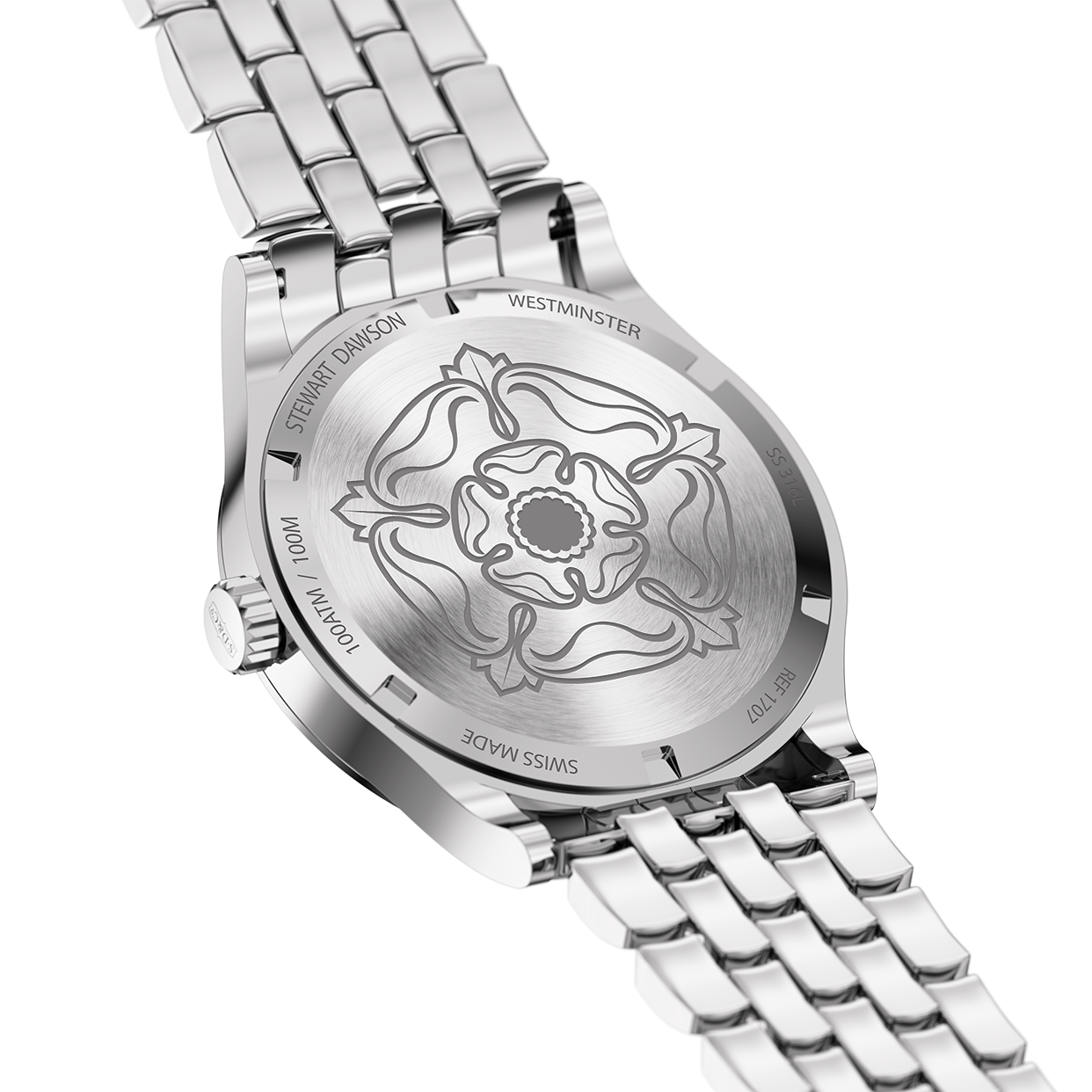 The Westminster's case is a masterclass in understated elegance, sculpted from solid 316L stainless steel to achieve an exceptionally slim profile. Its slender design and polished surfaces allow it to slip effortlessly beneath a dress cuff, offering a presence of refined sophistication without unnecessary bulk or weight.